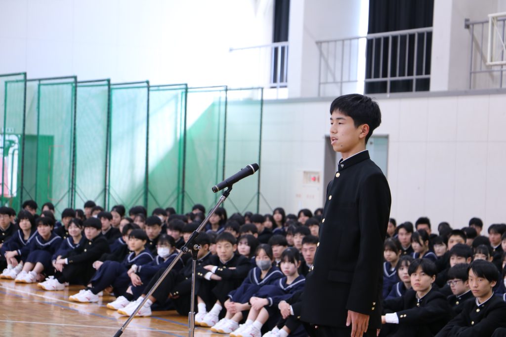 令和8年度 新任式・始業式・対面式が行われました 2026年4月12日 4月8日(水)新任式が行われ、新たに9名の教職員の方を本校にお迎えしました。続いて1学期始業式、1年生と2・3年生の対面式が行われました。 新入生代表の氷坂さんから上級生への挨拶がありました
