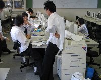 平成18年6月7日(水)の放課後、オープンスクールの開催を10日後に控え、打ち合わせや資料作りなど様々な準備に追われる委員の中で、中心としてがんばっている委員長の末さん(3年)に今年のオープンスクールについてインタビューしました。