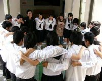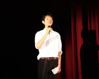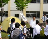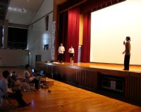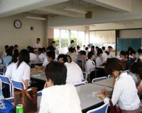 プレゼンテーション直前に全員で円陣を組んで、気合いを入れました。 | プレゼンテーションの最後に挨拶をする委員長の笹井くん。プレゼンテーションは大成功。彼の言葉にも充実感が漂っていました。 | プレゼンテーションの後は、グループごとに別れての行動となりました。これは授業体験の様子。高校の授業の一端を味わってもらいました。 |