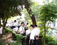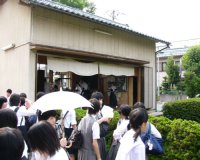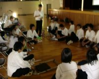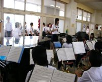 こちらは生物部。カメを飼っている水槽を中学生のみなさんと眺めていたようですが…。見つかったのでしょうか。 | こちらは弓道部。中学校には無い部活動ですから、興味を持つ人は多かったようですね。 | 吹奏楽部の練習にも多くの見学者が集まったようです。生徒諸君の演奏にも力が入りました。 |