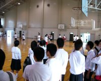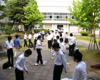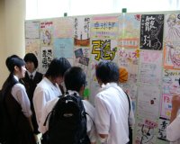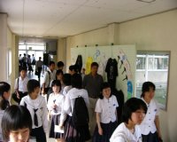 こちらは「藤高生と語る会」です。本校在学生が出身中学の後輩諸君とざっくばらんに語り合う…という企画でした。 | こちらは「校内ツアー」の様子です。グループごとに部活動を実際に体験してもらう…という企画でした。これはジャグリングを体験しているところですね。 | 中学生のみなさんで混み合う渡り廊下です。後ろの方に、学校祭のTシャツとうちわを展示しているのが見えますね。 |